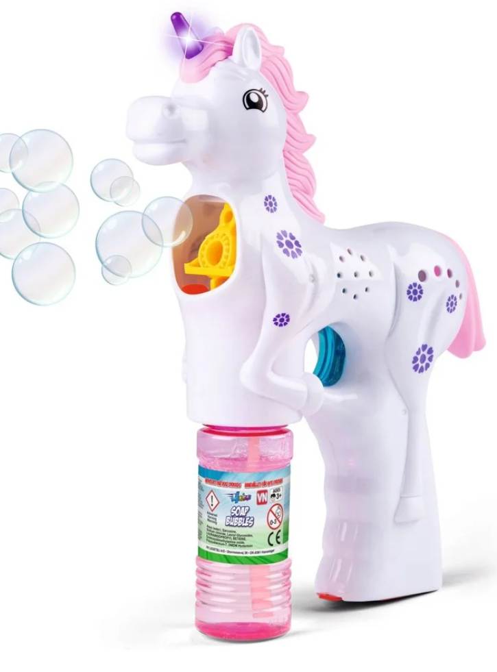 Jucăria în formă de unicorn are un mecanism pentru suflat bule de săpun.