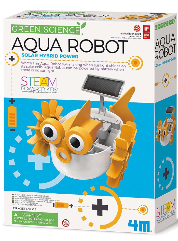 Aqua Robot poate fi alimentat de la lumina soarelui sau de la o baterie, asigurând un timp de joacă neîntrerupt și permițând copiilor să învețe despre energia regenerabilă.