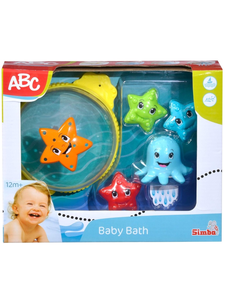 Cu setul joacă pentru baie ABC, cei mici se distrează de minune în cadă. Steaua de mare colorată în roșu, albastru și verde poate înota vesel pe apă. O a patra stea de mare se odihnește pe plasa de pescuit.
