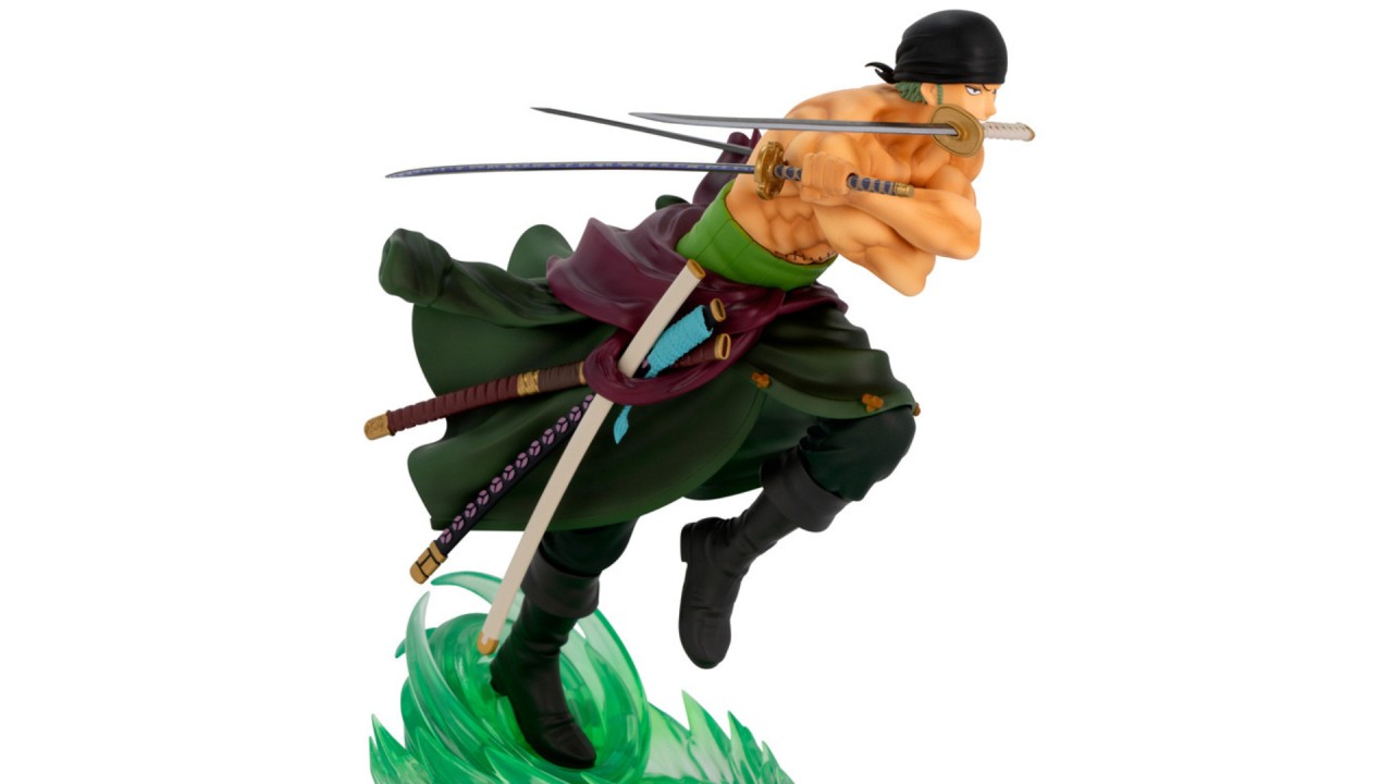 The figure is crafted with great attention to detail, reflecting Zoro's iconic features such as the green tunic, the bandage over his left eye and his sword, Santoryu (the traditional three-sword fighting style).