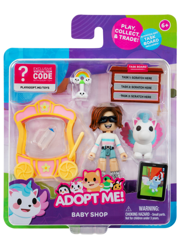 Bine ați venit la Adopt Me Baby Shop, unde puteți cumpăra tot ce ține de bebeluși de la vânzătoarea Eda, inclusiv un clopoțel și un biberon.