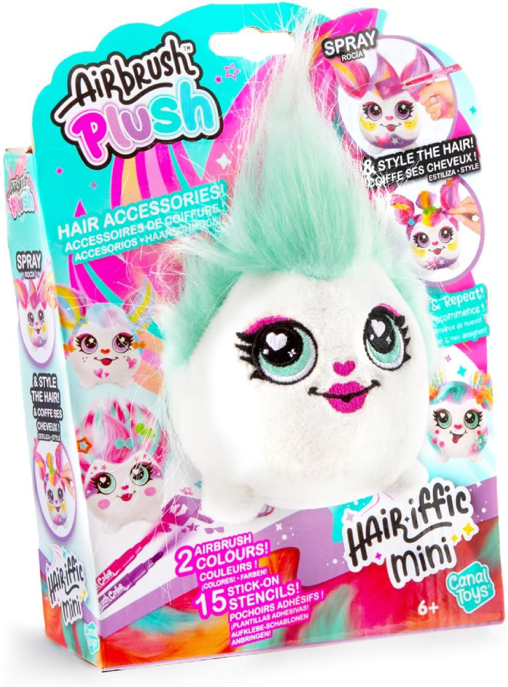 Hair’iffic Airbrush Plush este o serie de plușuri adorabile de dimensiuni mici, fiecare având păr special conceput pentru a fi stilizat și personalizat.