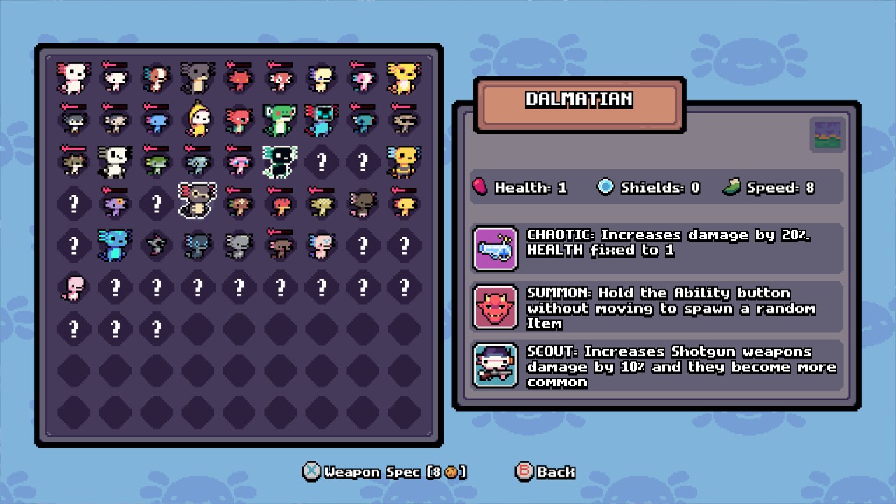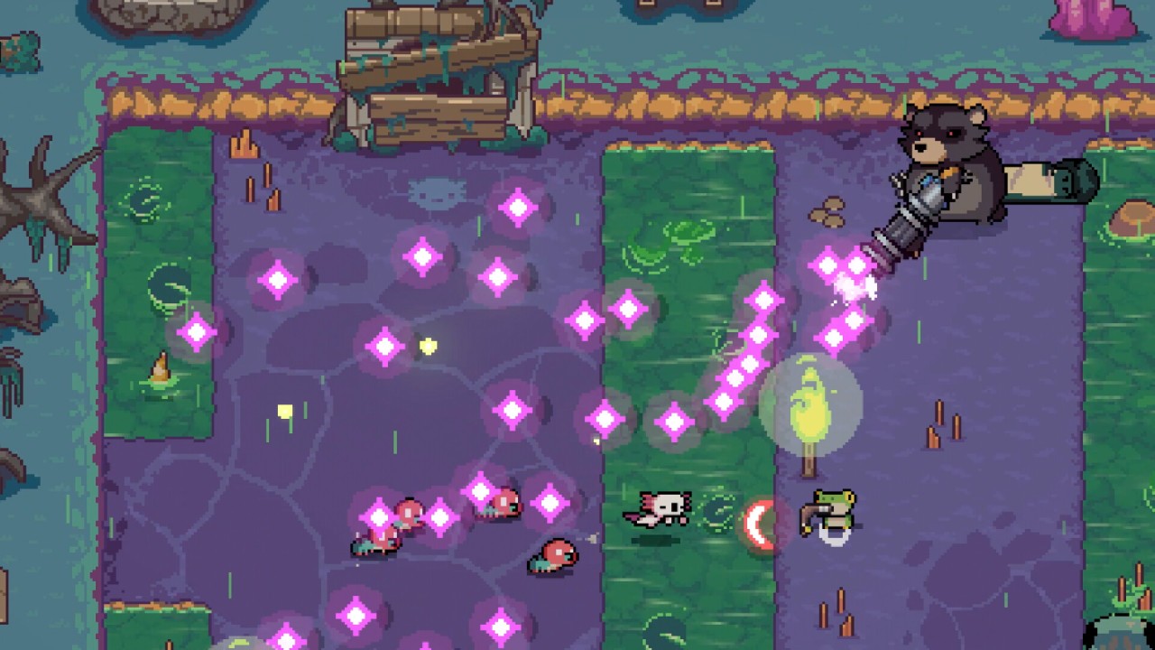 - Channel the incredible regenerative power of axolotls! If you get knocked down, you'll rise from the ashes and start stronger, unlocking new weapons with each battle.