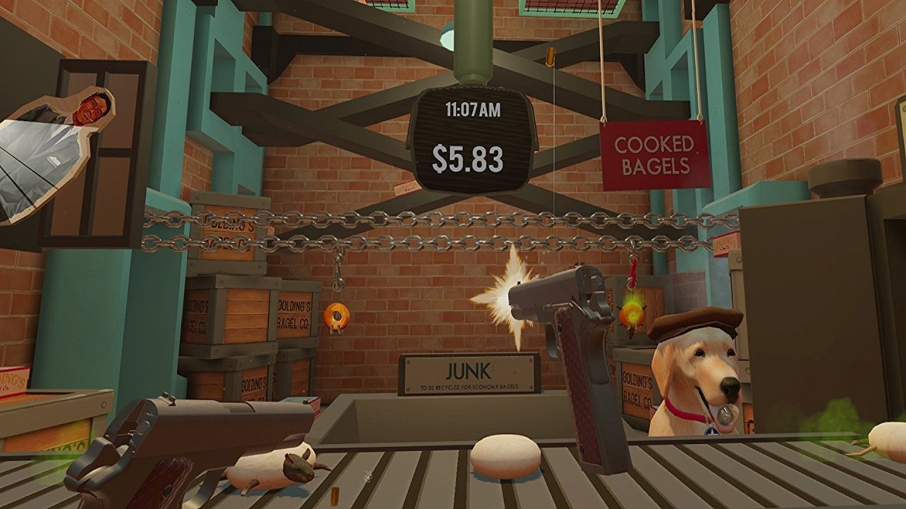 The American Dream is a satirical journey in virtual reality to a "brighter future" where everyday needs are solved with the help of guns.