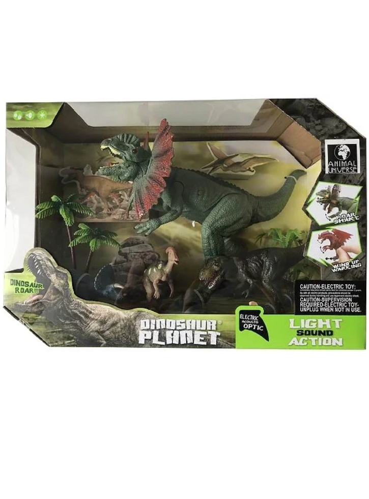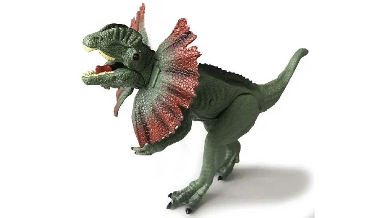 Dinozaurul mare vine cu baterii. Când apăsați piciorul înainte, acesta răcnește, ochii se aprind.