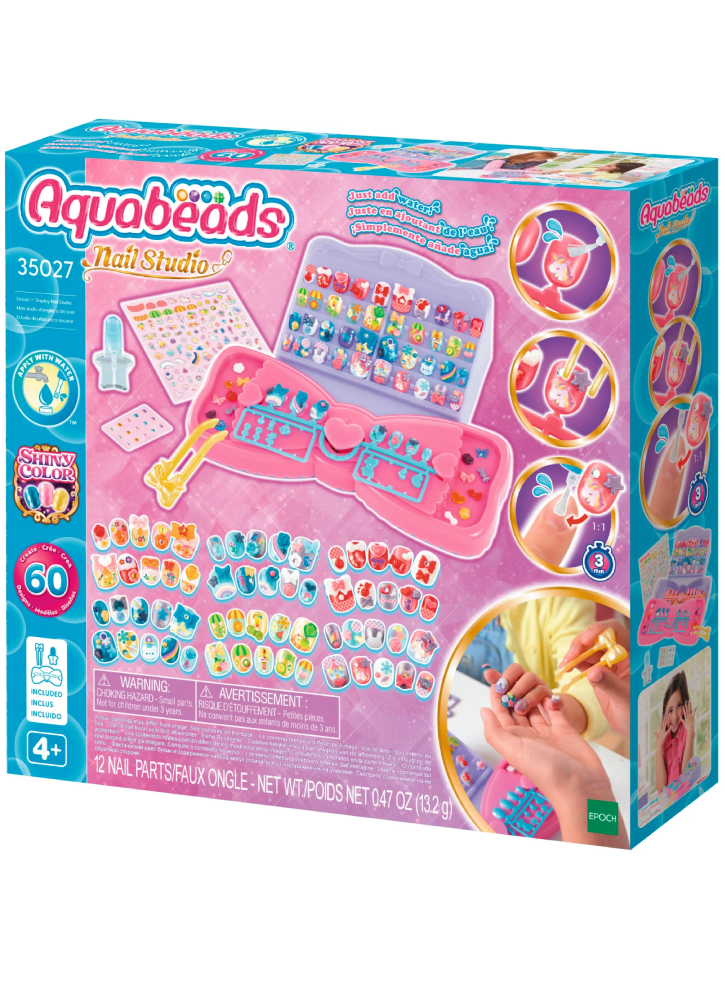 Include: 60 de unghii Aquabeads cu decorațiuni în 12 culori, masă de lucru, pensete din plastic, aplicator de apă cu perie, autocolante, suport de afișare, foaie de design și instrucțiuni.