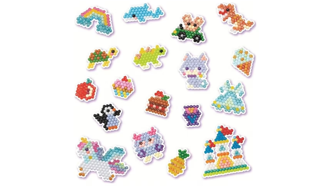 Include mărgele clasice, mărgele bijuterie, mărgele poligonale, mărgele stea în 48 de culori, inclusiv noile mărgele de acuarelă, creează mai multe modele de mărgele cu rezervele Aquabeads vândute separat.