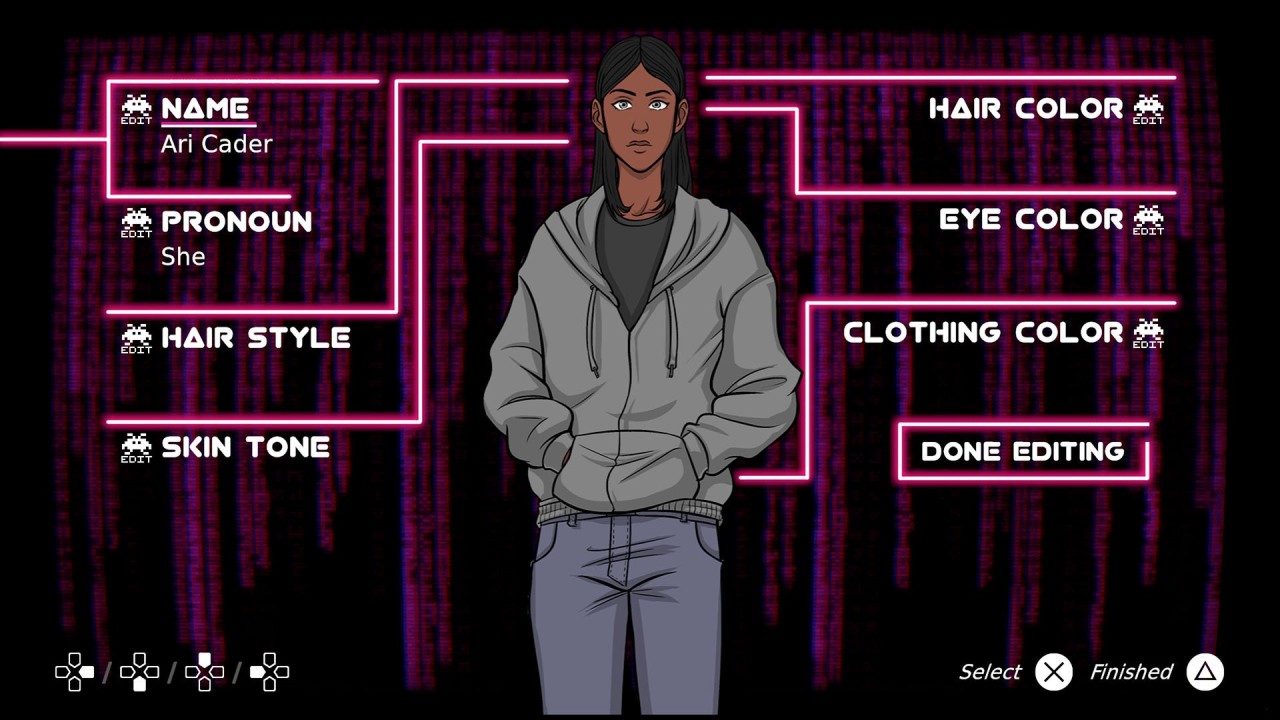 Proiectează-ți propriul personaj de la capăt - pronume, coafură, nuanța pielii, culoarea părului, culoarea ochilor și multe altele sunt complet personalizabile și se reflectă pe tot parcursul jocului atât în joc cât și în lucrări de artă!