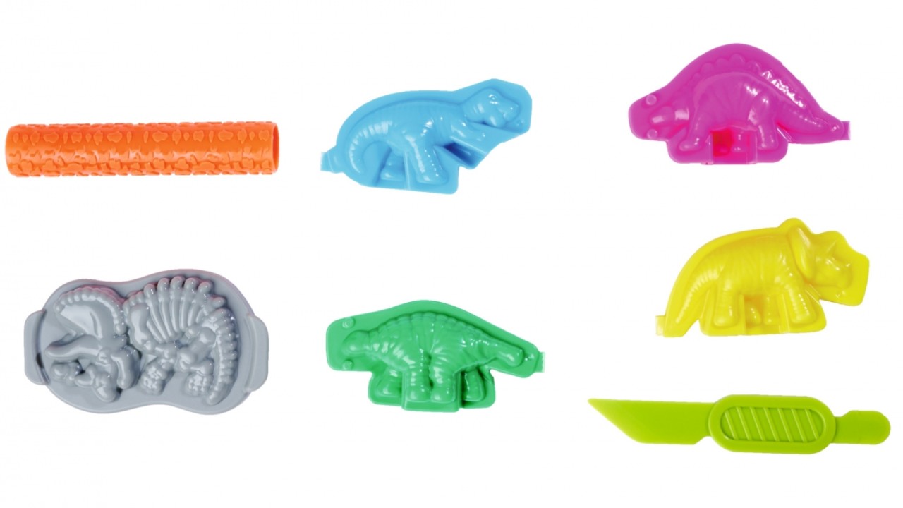 Cu forme de dinozauri - setul conține patru forme 3D de dinozauri și o matriță pentru fosile.