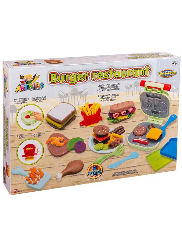 Kitul de ceară pentru restaurantul Burger este un set mare ce conține o găleată de ceară de modelare de 5x56 gr, un grătar pentru burger cu forme atât în interior, cât și în exterior, matrițe, farfurii și multe alte accesorii. Această gamă de produse este fabricată de VN Toys, un renumit producător de jucării.
