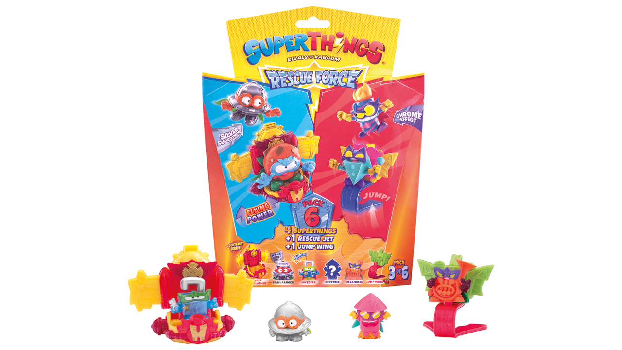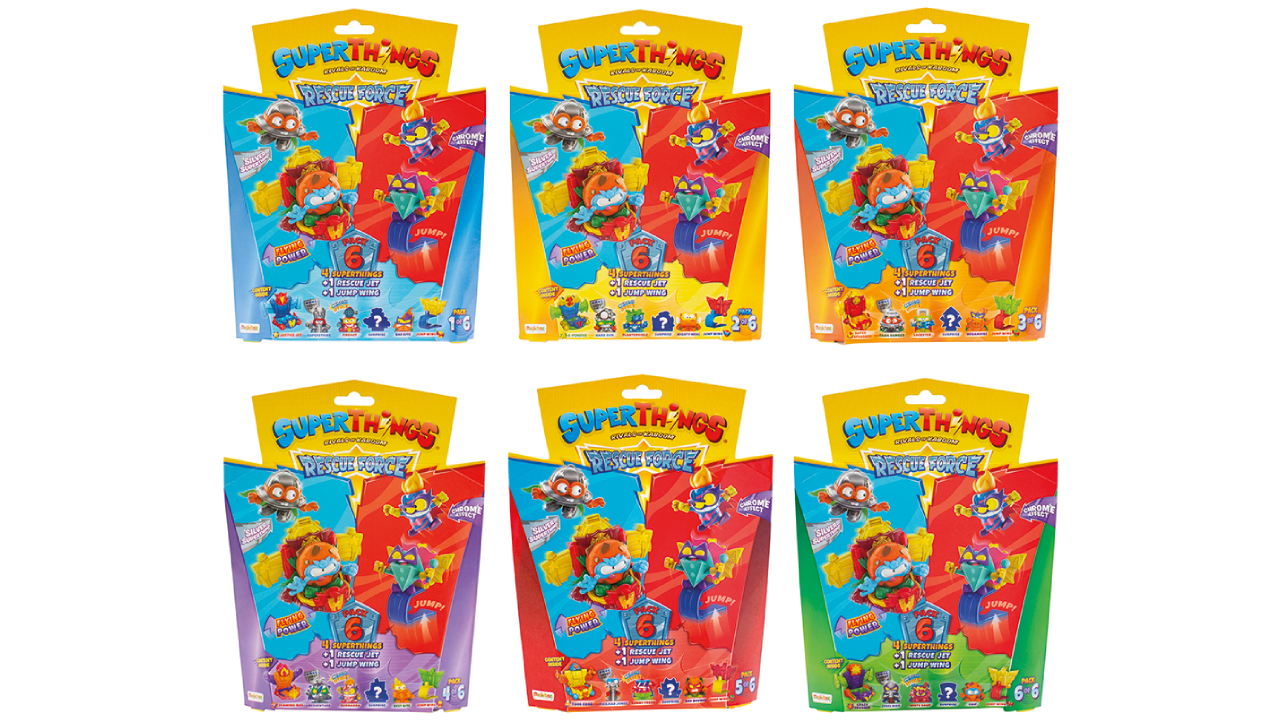 Cu 6 modele diferite de blistere de colecționat, fiecare pachet include un vehicul Rescue Jet, un lansator Jump Wing și 4 figurine SuperThings, inclusiv 1 personaj rar argintiu.
