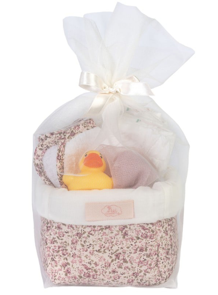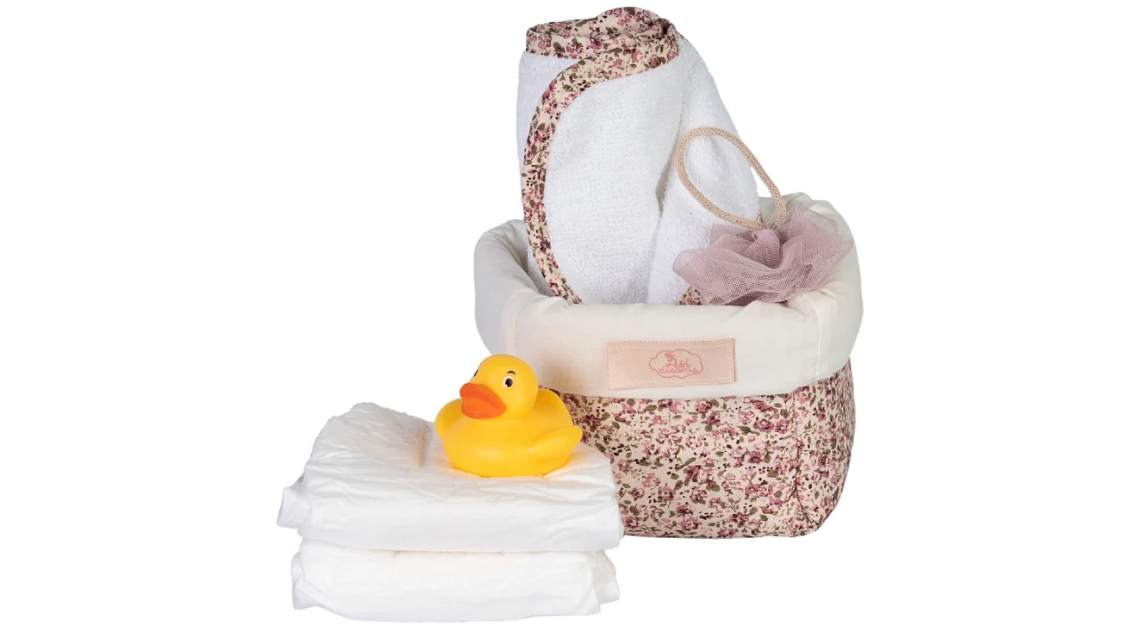 Acest set fermecător include două scutece, un prosop mic, un burete de baie practic și o rățușcă de baie galbenă drăguță.