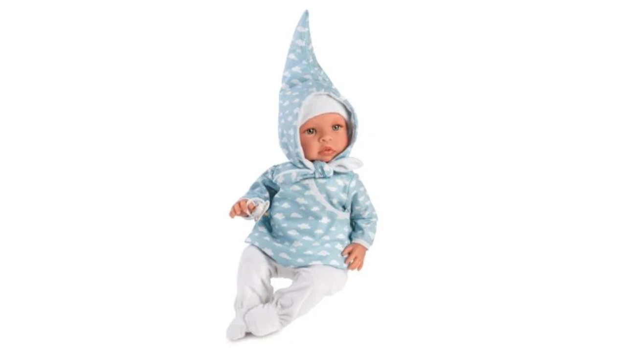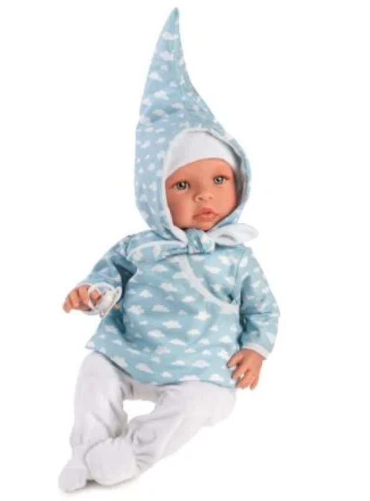 Iată-l pe Leo într-o hanorac albastru deschis cu mici nori albi, pantaloni lungi albi moi cu piciorușe și suzetă inclusă.
