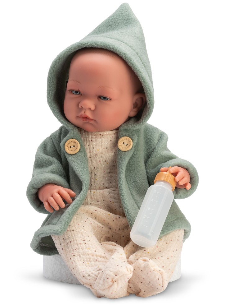 Păpușa vine îmbrăcată într-o ținută ușoară, cu mici puncte colorate, completată de un palton călduros de culoare verde deschis.