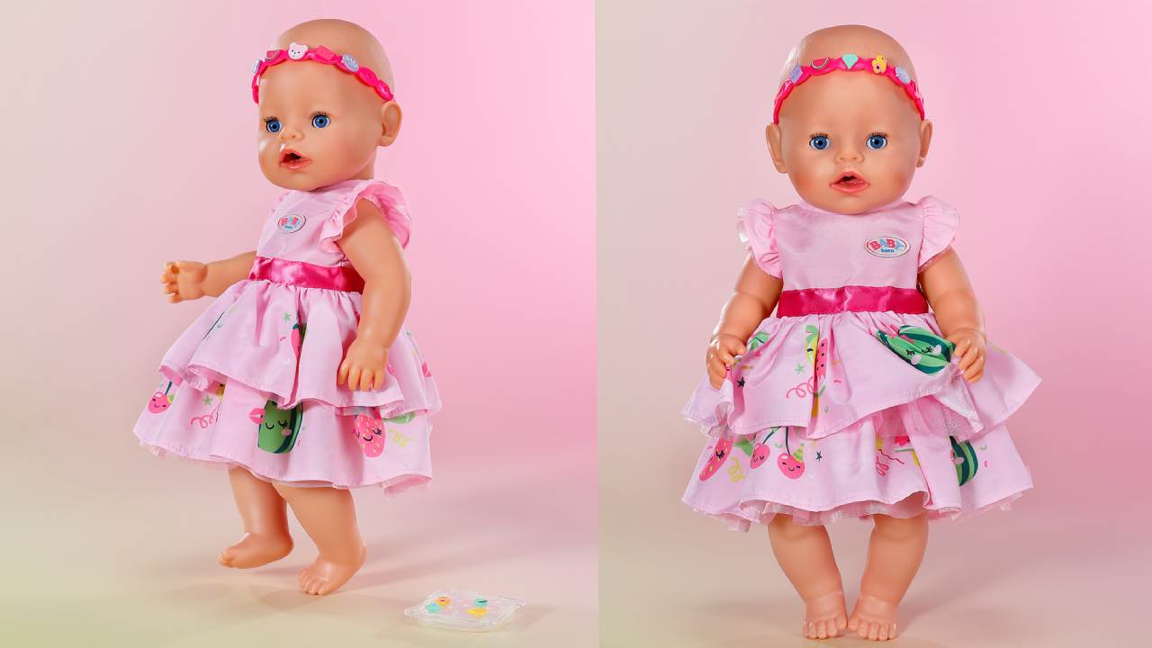 Micuții părinți ai păpușilor vor adora să-și îmbrace păpușa BABY born în rochia roz strălucitoare, cu designul său distractiv și fusta vaporoasă, în straturi.