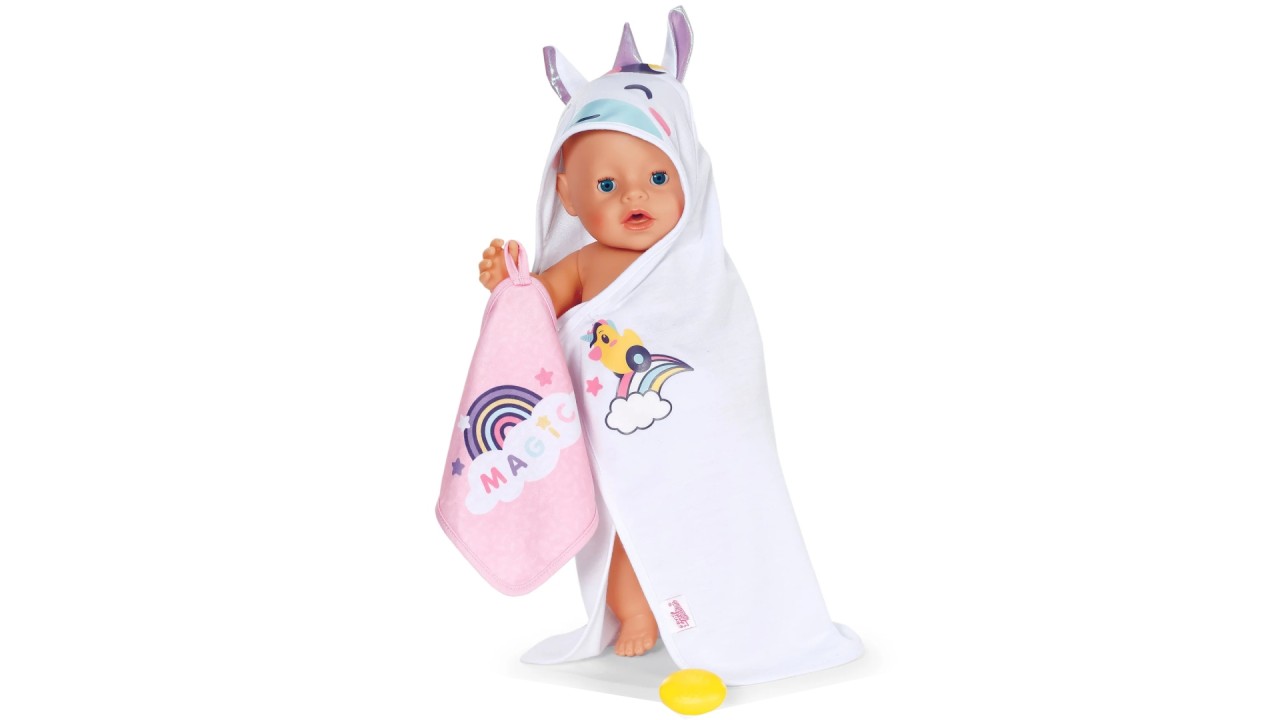 Hai să ne jucăm de baie! Setul minunat de prosoape cu glugă de la BABY born conține un prosop cald și pufos, cu corn de unicorn, urechi și un design distractiv cu unicornul Berta.