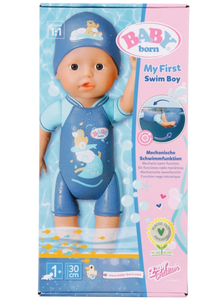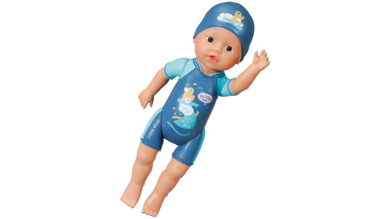 Costumul său de baie albastru și șapca de baie sunt imprimate direct pe corp ca un relief și împodobite cu motive dulci.