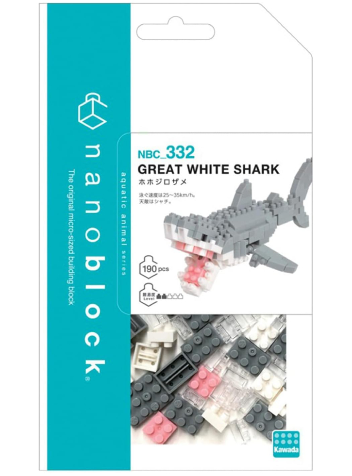 Rechinul mare alb din seria Collection de la Nanoblock are o înălțime de aproximativ 1,9” și 130 de piese.