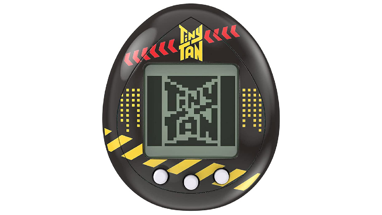 An exclusive Black version BTS TinyTAN Tamagotchi device that includes a soft vinyl figure of the TinyTAN character hugging the Tamagotchi.