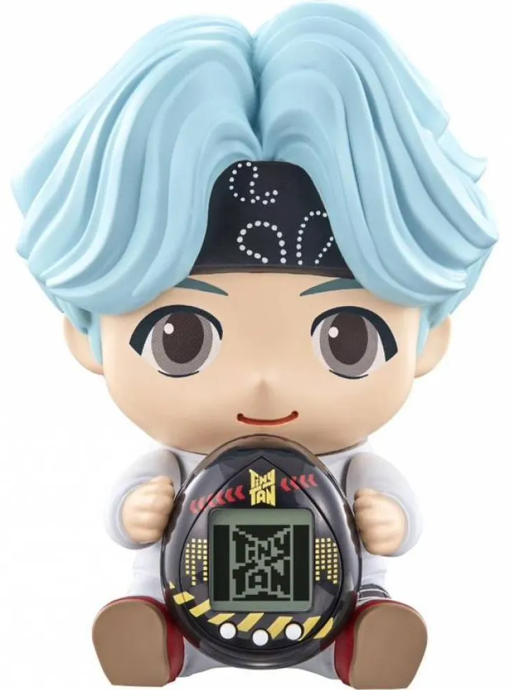 Un dispozitiv Tamagotchi BTS TinyTAN Tamagotchi exclusiv în versiunea neagră, care include o figurină de vinil moale cu personajul TinyTAN care îmbrățișează Tamagotchi.