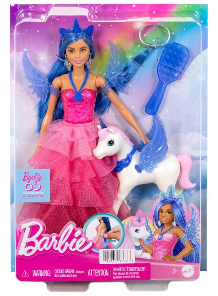 Inspired by her character in Barbie A Touch of Magic, this Barbie doll features a beautiful alicorn, a winged unicorn.