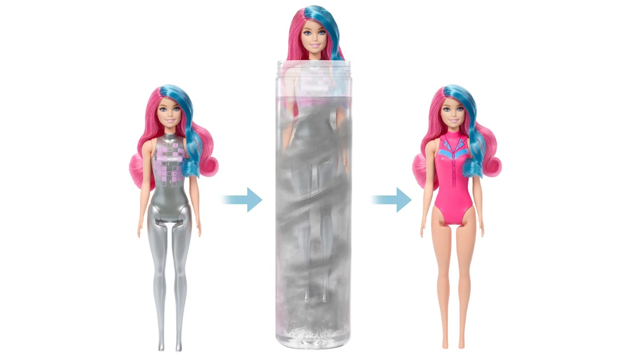 Discover the surprise! The adventure begins by removing the outer layer of packaging, then opens the tube to reveal a Barbie Color Reveal Disco Star doll, covered with a mysterious opaque layer.