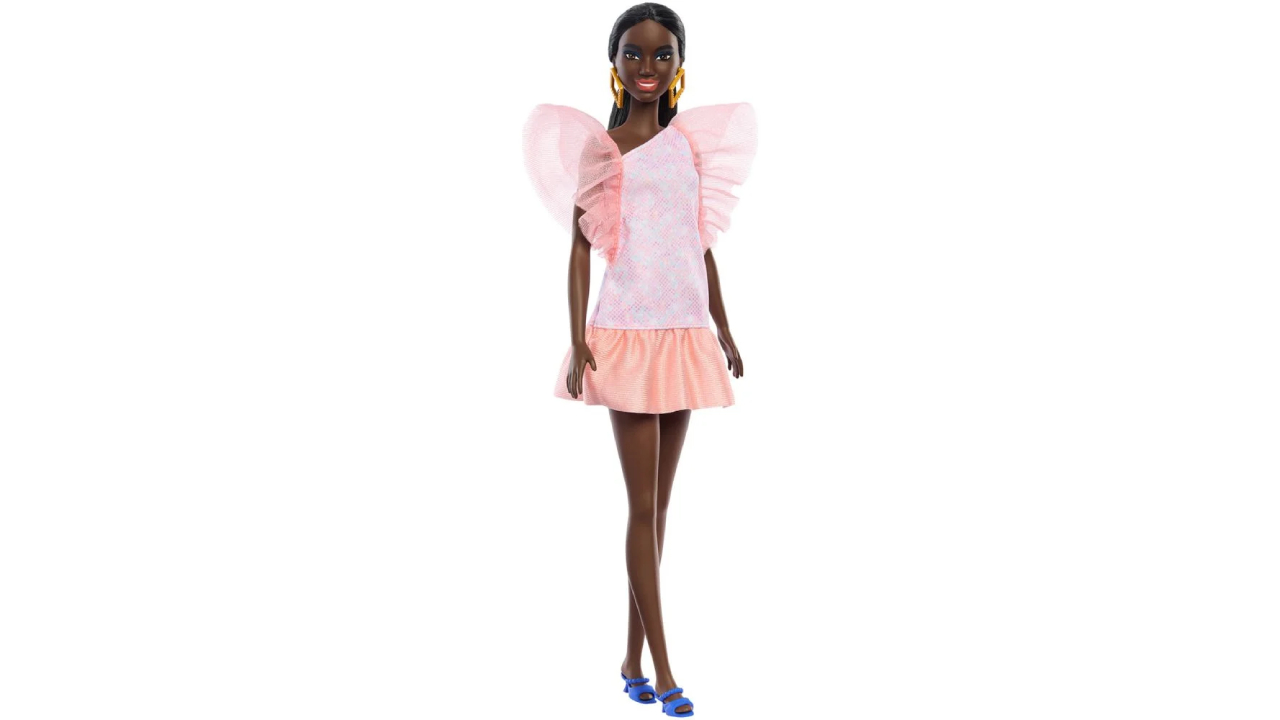 Cu această frumoasă păpușă manechin, copilul dvs. va putea vedea o păpușă Barbie Fashionista îmbrăcată într-o frumoasă rochie roz cu volane mari de culoarea piersicii pe mâneci și în partea de jos a rochiei.