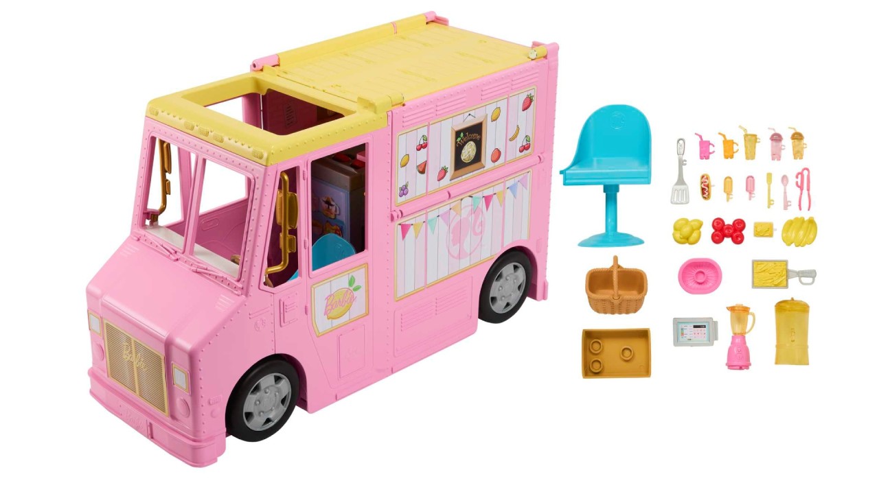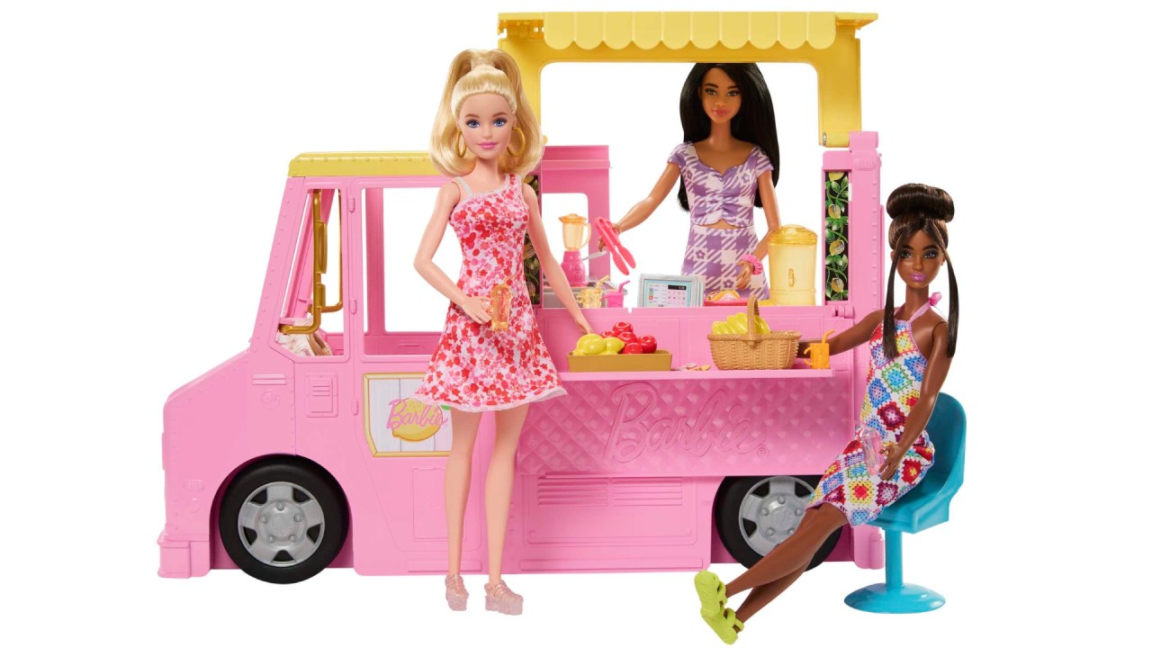 This Barbie lemonade truck playset comes with 25 story pieces, offering everything a Barbie doll could dream of to make the tastiest refreshments in town.