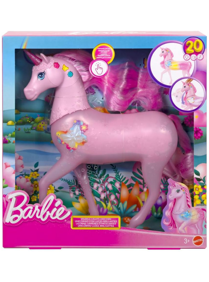 Strălucește cu Barbie Sparkle Lights Unicorn! Copiii pot activa 20 de combinații diferite de lumini și sunete, cu o mulțime de moduri de joacă.