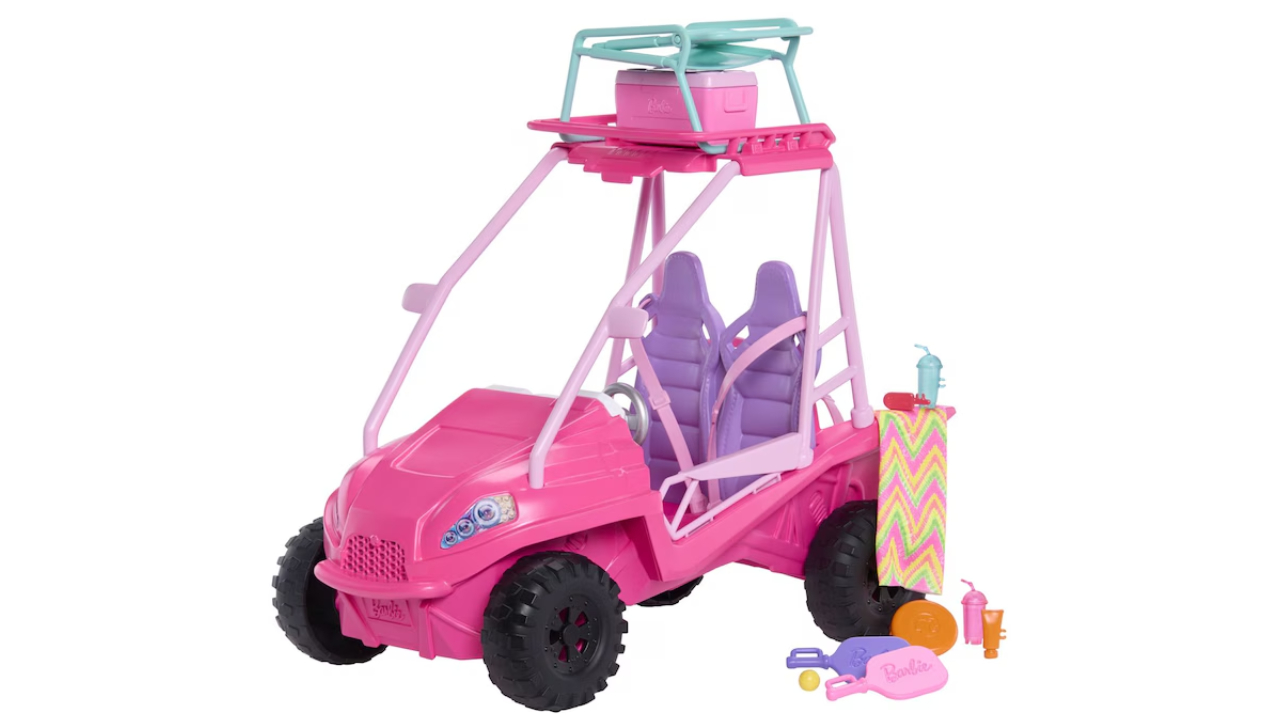Inspired by the hit series, this sporty beach car transports fans to the shore, featuring a hot pink exterior, a roof rack and seating for up to four dolls (sold separately).