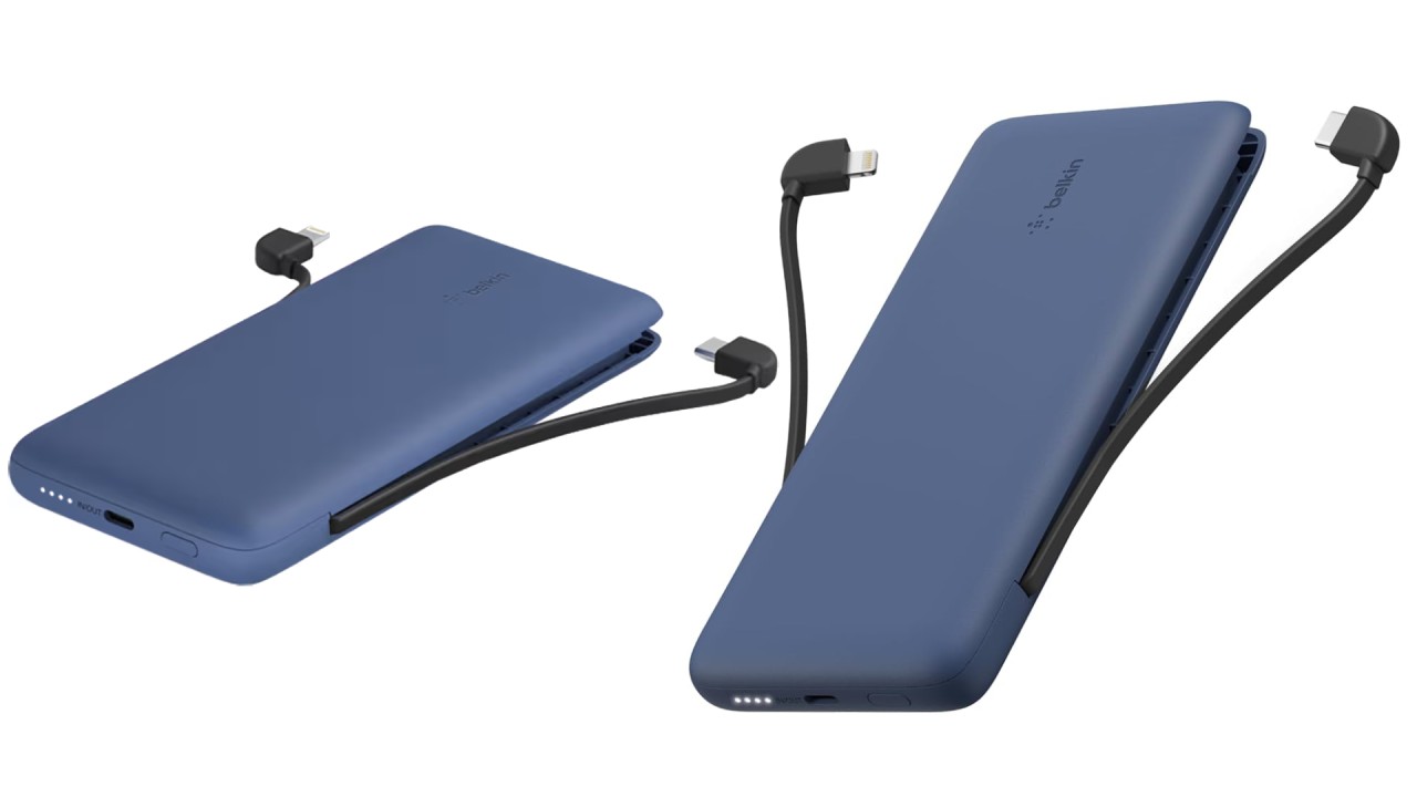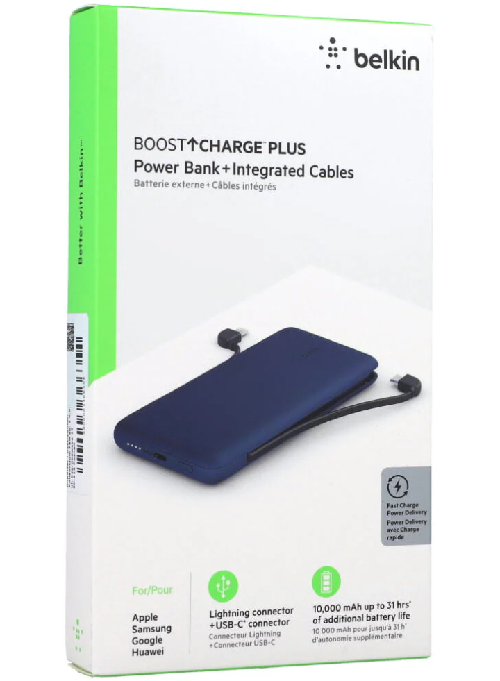 Universal and compact external battery with a capacity of 10000mAh from Belkin with USB-C and Lightning outputs, designed for most smartphones and tablets.