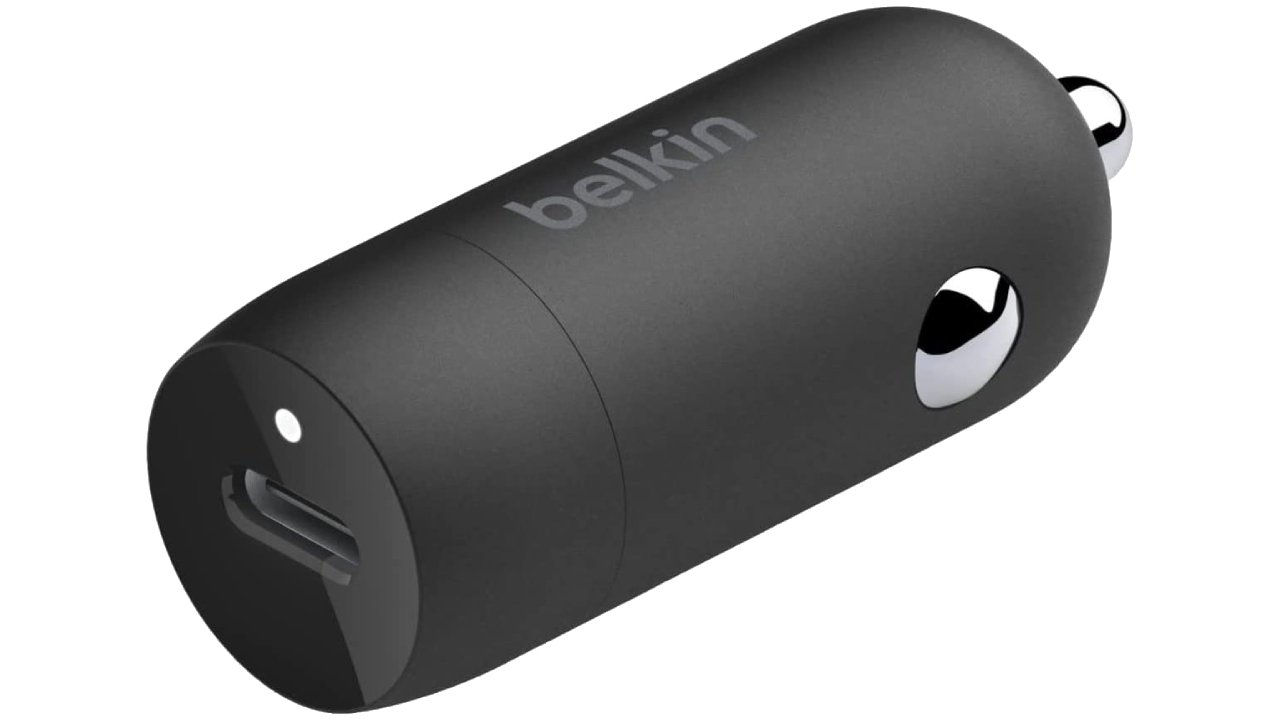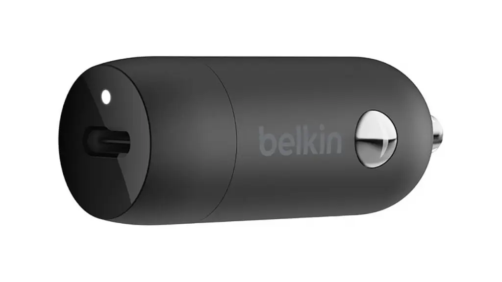 Un încărcător auto Belkin compact și ușor din seria Boost Charge, conceput pentru a încărca toate dispozitivele mobile cu un cablu USB Type-C.