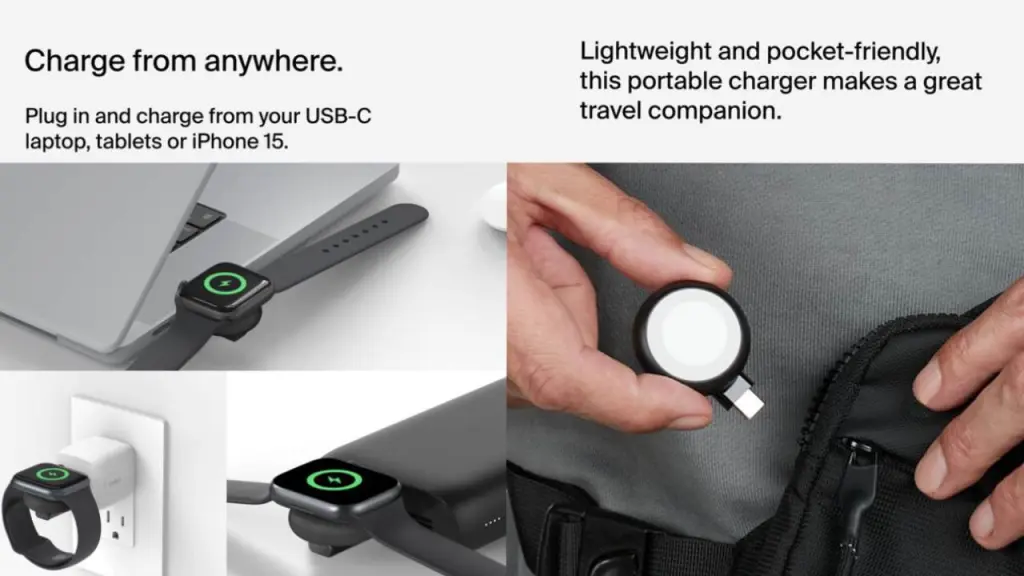 Încărcați Apple Watch oriunde folosind diverse dispozitive, inclusiv MacBook-uri, seria iPhone 15 și bănci de energie.