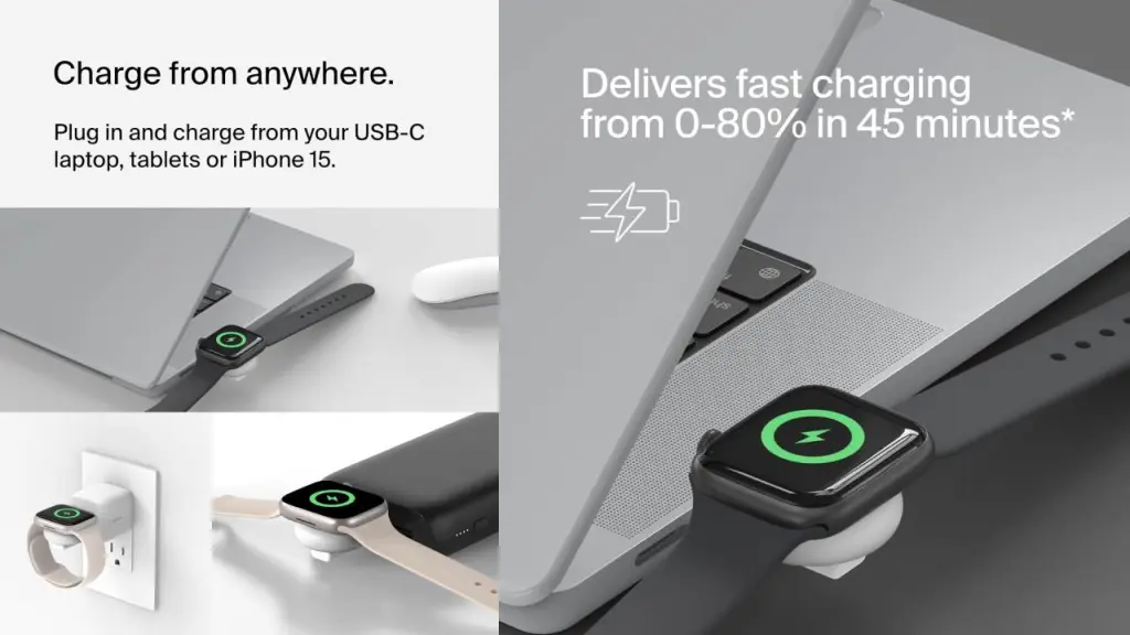 Mai bine, vă puteți încărca rapid Apple Watch Series 7 și ulterioare de la 0-80% în 45 de minute, plus Apple Watch Ultra 1 și 2 până la 5W.