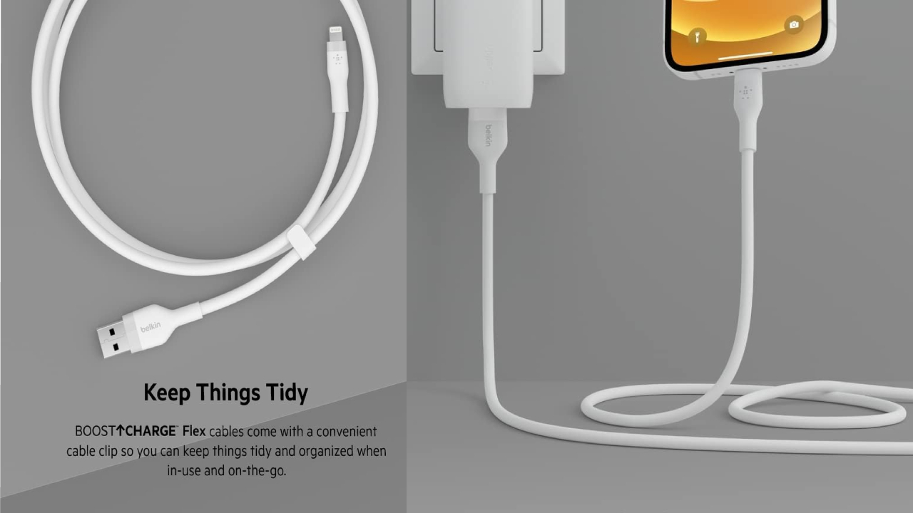 Toate cablurile BOOST CHARGE Flex includ o clemă de cablu convenabilă pentru depozitare ușoară și organizată, păstrând lucrurile în ordine atunci când sunt utilizate sau în mișcare.
