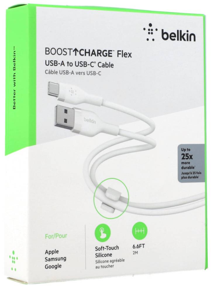 Cablurile BOOST CHARGE Flex adaugă moliciunea siliconului și flexibilitatea pliabilă la încărcare, oferindu-vă un cablu USB-A la USB-C care nu se va încurca, îndoi sau rupe cu ușurință.
