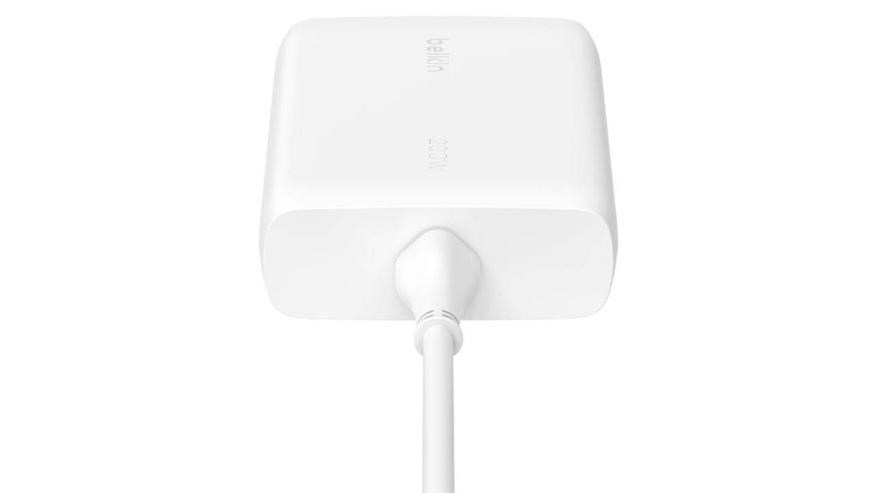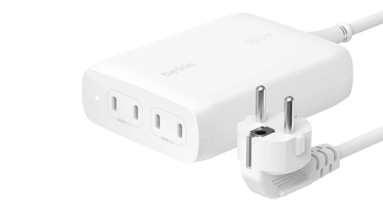 Incărcător de perete original Belkin Boost ↑Charge Pro cu 4 porturi, cu tranzistoare din nitrură de galiu (GaN) care generează mai puțină căldură decât componentele standard din siliciu.