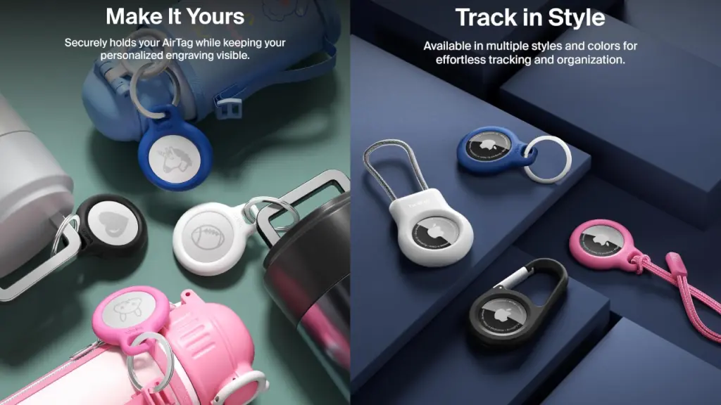 Alegeți din patru culori elegante negru, alb, roz și albastru, care completează perfect AirTag-ul, păstrând în același timp designul elegant și gravurile personalizate la vedere.