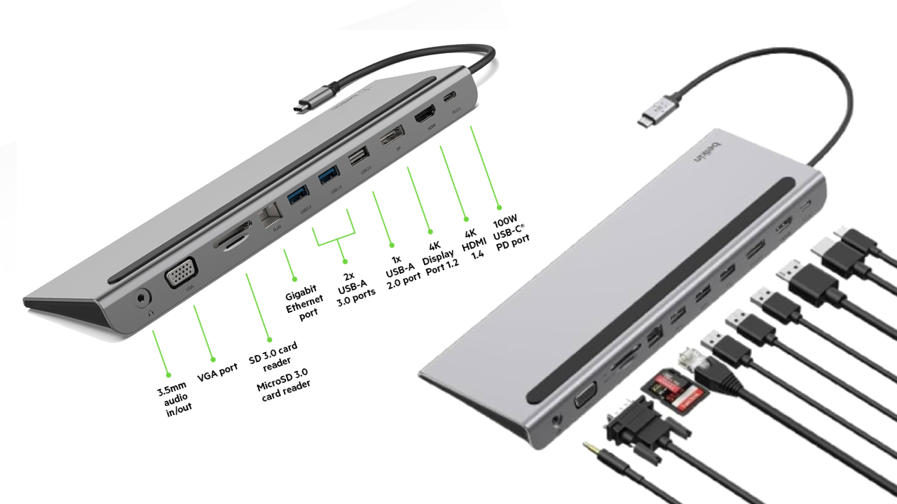 - Extinde portul USB-C într-un port HDMI, DisplayPort, port VGA, 3 porturi USB-A, port Gigabit Ethernet, cititoare de carduri SD și MicroSD, port audio de 3,5 mm și port USB-C PD