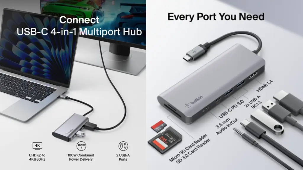 Hub-ul vă permite să conectați 1 monitor 4K/30Hz la stația de lucru, în funcție de specificațiile laptopului în sine.