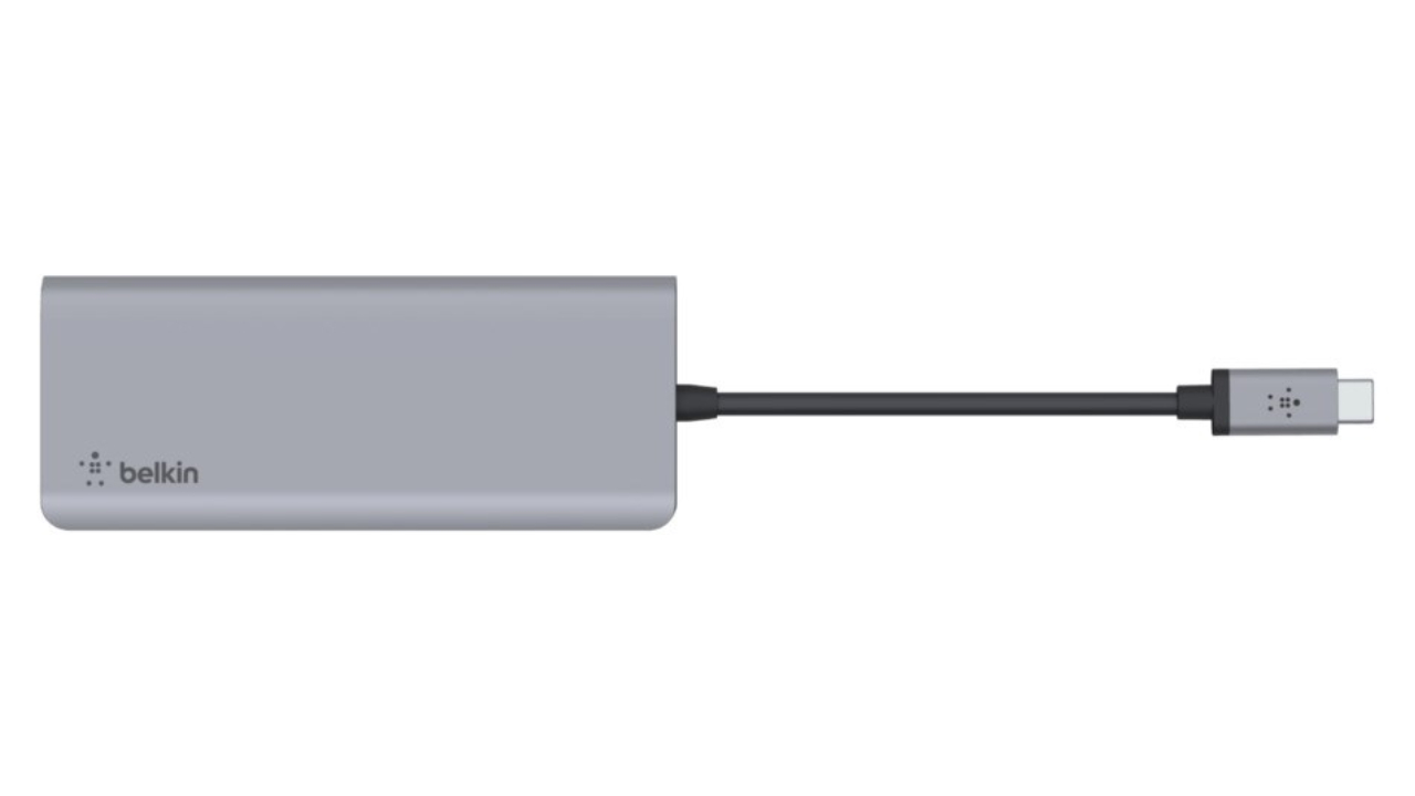 Stație multiport originală Belkin proiectată pentru laptopuri cu conector USB-C cu suport video.