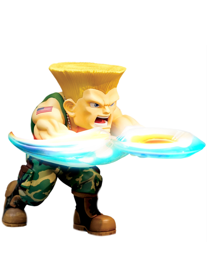 Figura oficială Street Fighter. Street Fighter The New Challenger Guile este o figurină din PVC pre-vopsită, fără scară, cu licență oficială, care dispune de lumină LED și efecte sonore.