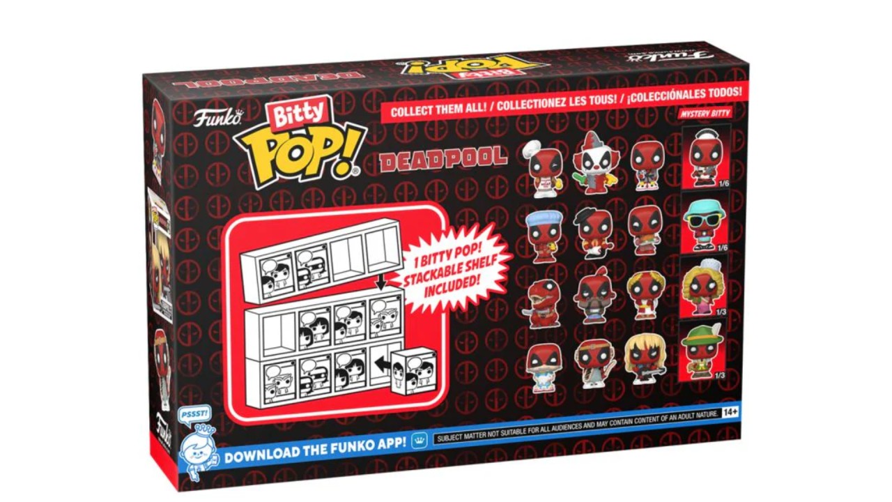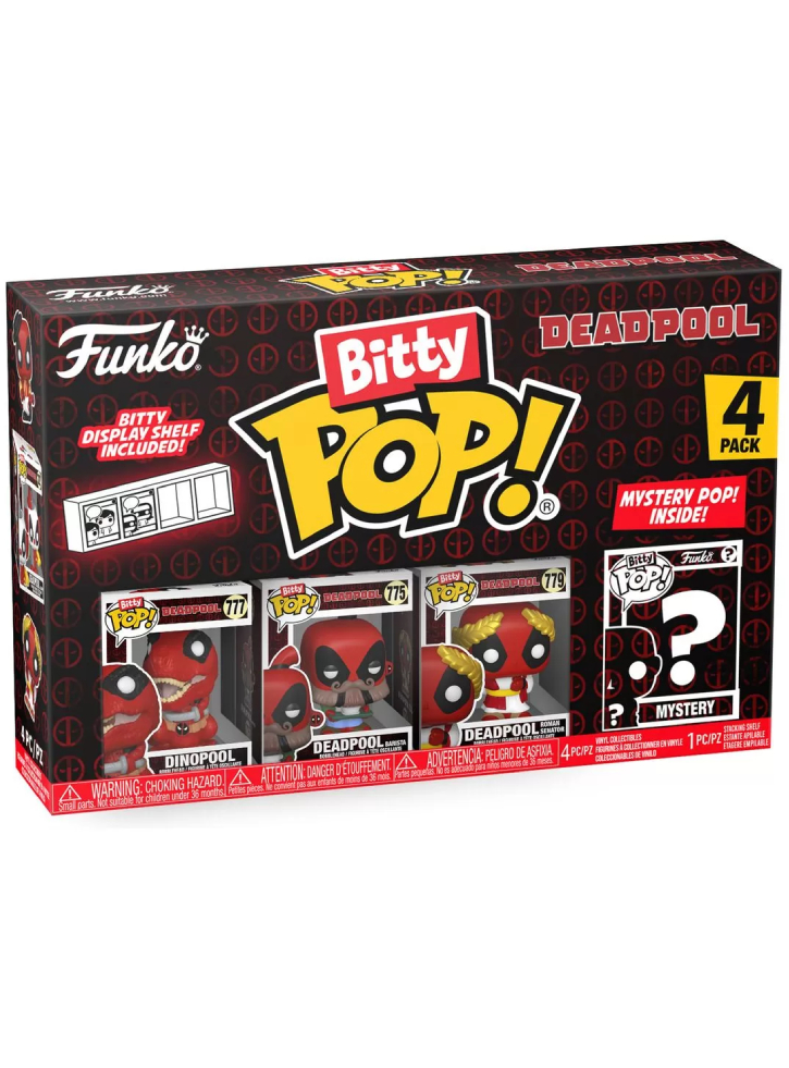 Acest pachet de 4 include Bitty Pop! Dinopool, Bitty Pop Deadpool (Barista), Bitty Pop Deadpool (Senator Roman), și o figurină Bitty Pop misterioasă.