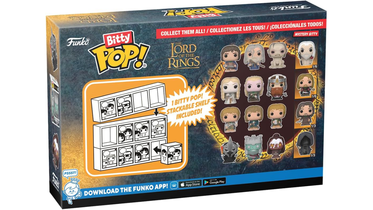 Posibilele Bitty Pops misterioase sunt Rare (1/3) Aragorn, Rare (1/3) Nazgul, Hyper Rare (1/6) Boromir și Hyper Rare (1/6) Saruman.