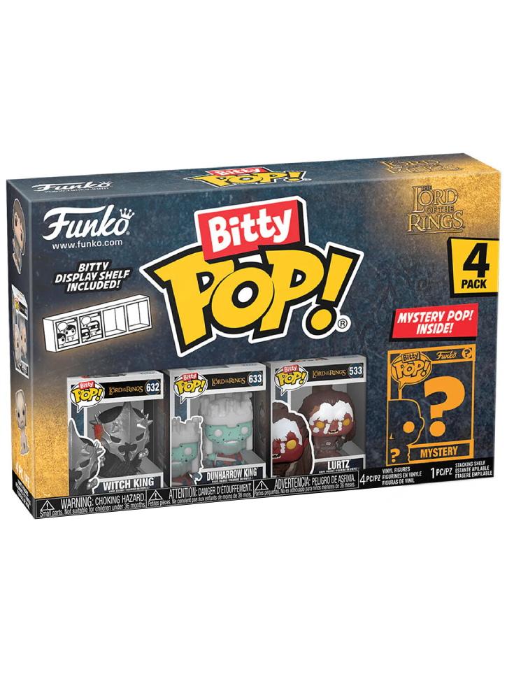 Acest pachet de 4 include Bitty Pop Regele Vrăjitor, Bitty Pop Dunharrow King, Bitty Pop Lurtz, și o figurină Bitty Pop misterioasă.