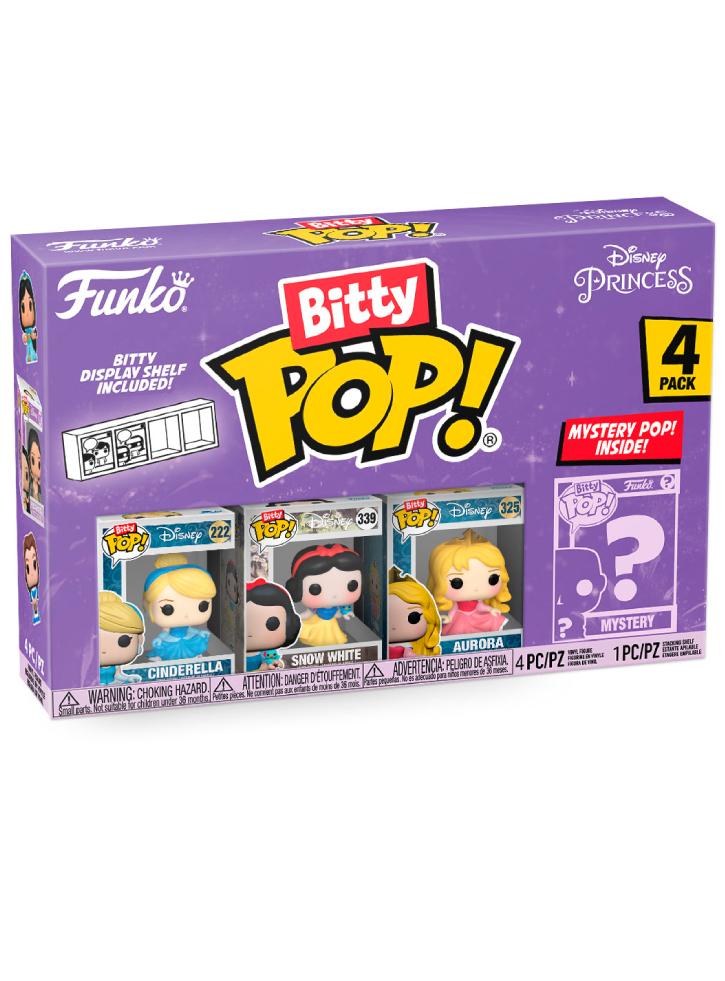 Acest pachet de 4 include figurine Bitty Pop! Cenușăreasa, Albă ca Zăpada, Aurora și o figurină Bitty Pop! misterioasă.