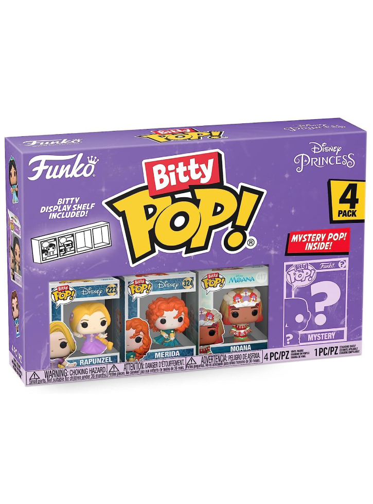 Această colecție de 4 figurine Bitty Pop! include modelele Rapunzel, Merida, Moana și o figurină Bitty Pop! misterioasă.