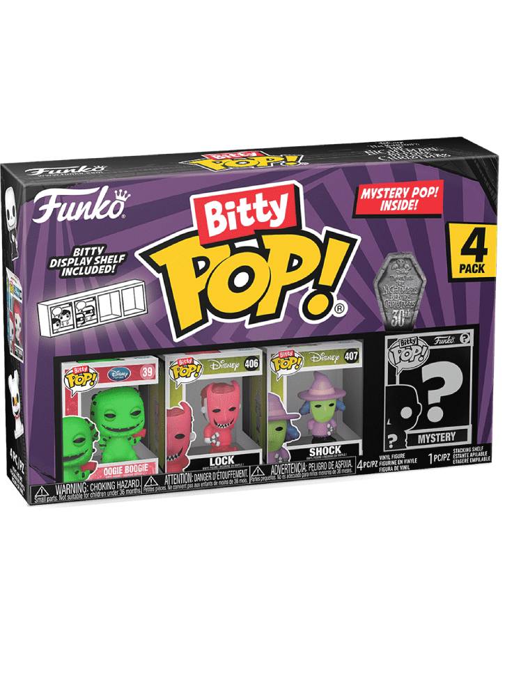 Acest pachet de 4 include Bitty Pop Oogie Boogie, Bitty Pop Lock, Bitty Pop Șoc și o figurină misterioasă Bitty Pop.