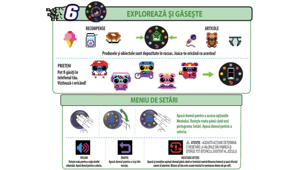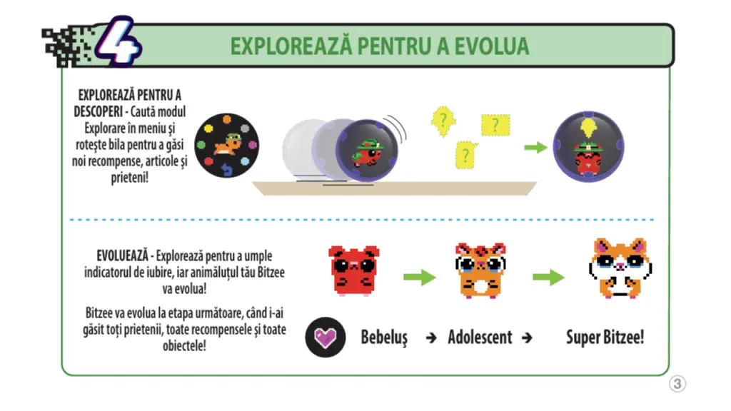 Aruncă mingea pentru a găsi recompense, obiecte și prieteni Bitzee cu tematică de baseball, gătit, magie, spa și multe altele, prietenii evoluează alături de eroul tău și interacționează cu el.