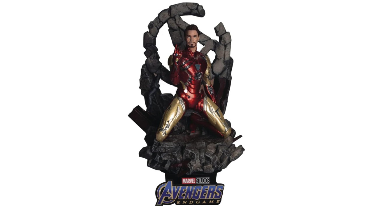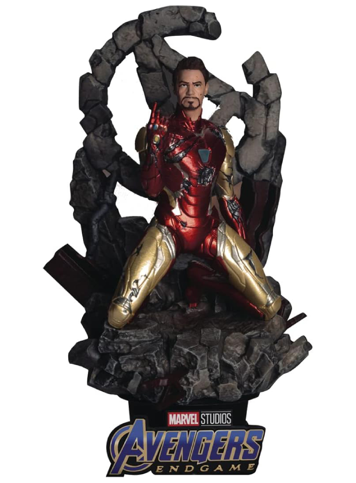 Recreând cu acuratețe această scenă faimoasă, D-Stage-081 îl potrivește cu Tony Stark cu un fundal 3D detaliat, care include o siglă Avengers căzută.